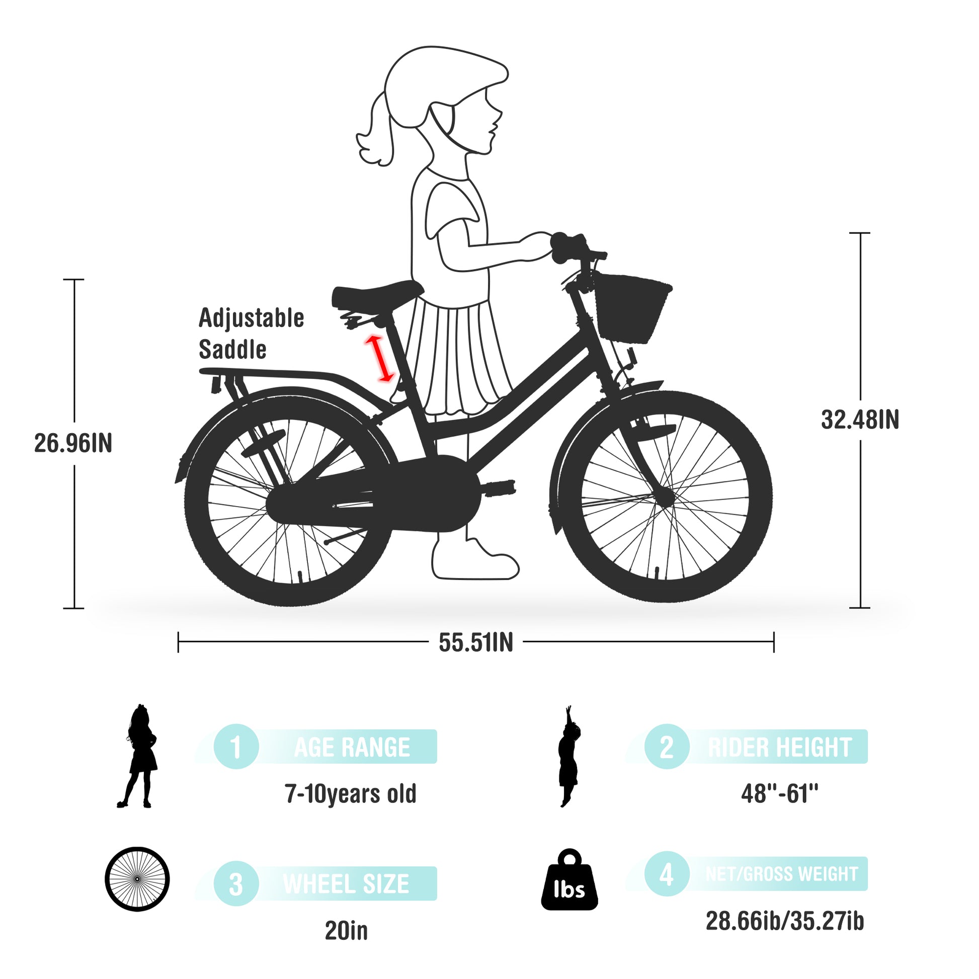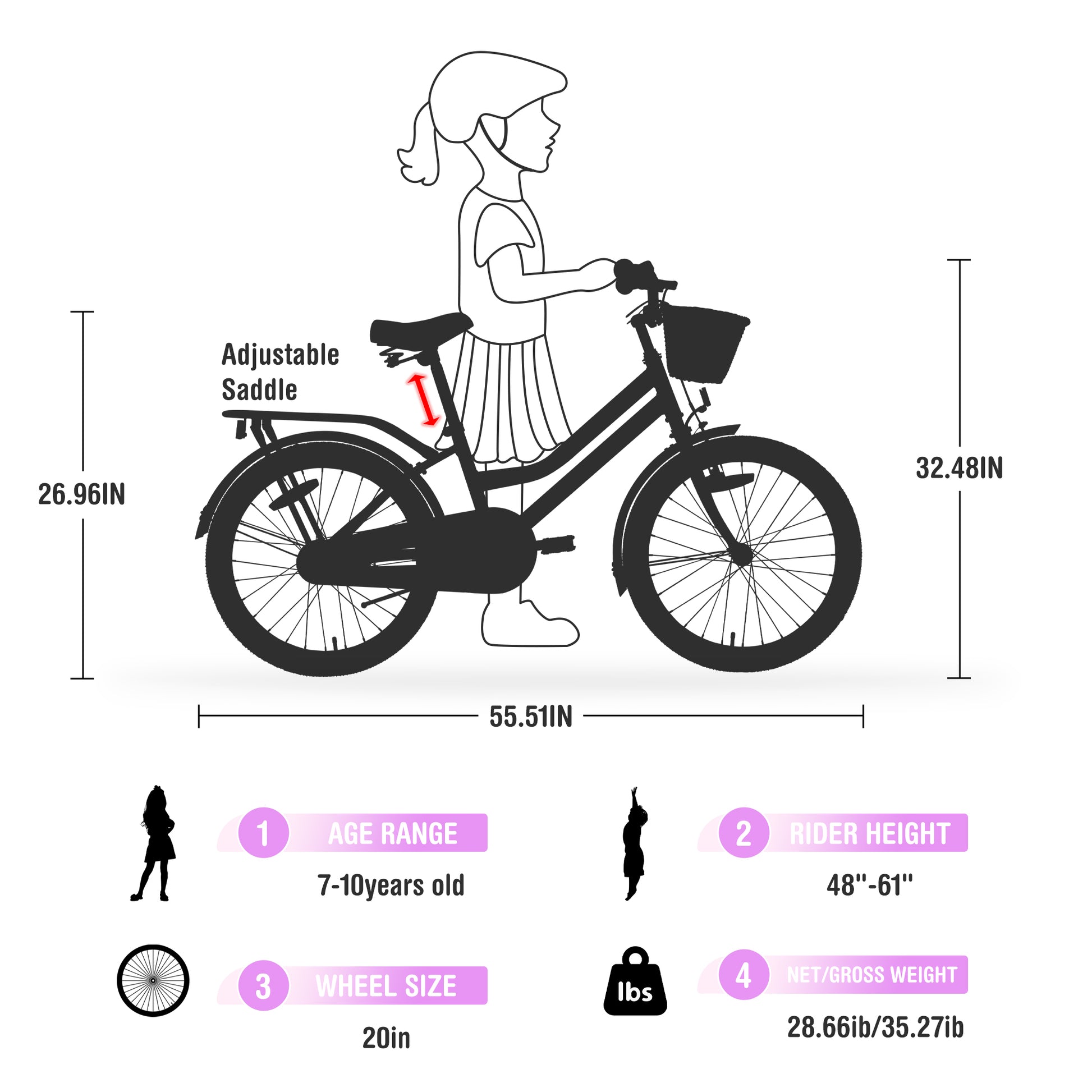 20 Inch Girls Bike for 7-10 Years Old Kids, SHINPT Kids Bicycle with Basket & Lightweight, Comfortable City Bikes with Rear Rack and Basket, Pink
