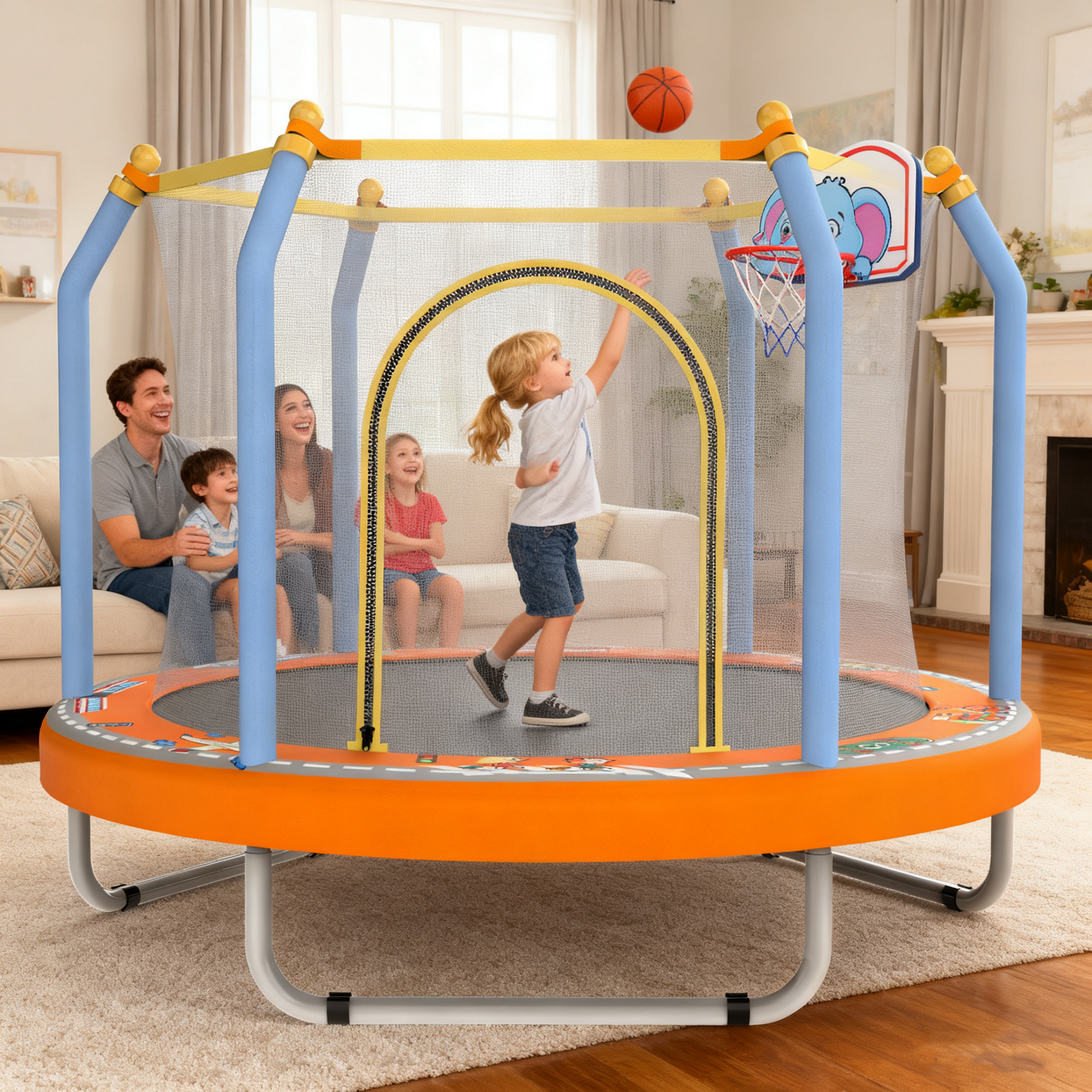 55" Toddler Trampoline with Enclosure Net, SHINPT Child's Mini Trampoline with Basketball Hoop, Round Recreational Tranpolines for Birthday Gifts, Kids Trampoline for Aged 3-6, Indoor & Outdoor
