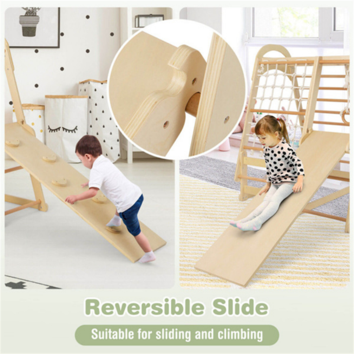 <p>💙49" Long Double-side Slide:The Wooden Climber Playset features a 49" slide with a smooth side for sliding and a textured side for climbing, bring double the fun with one simple flip!</p>