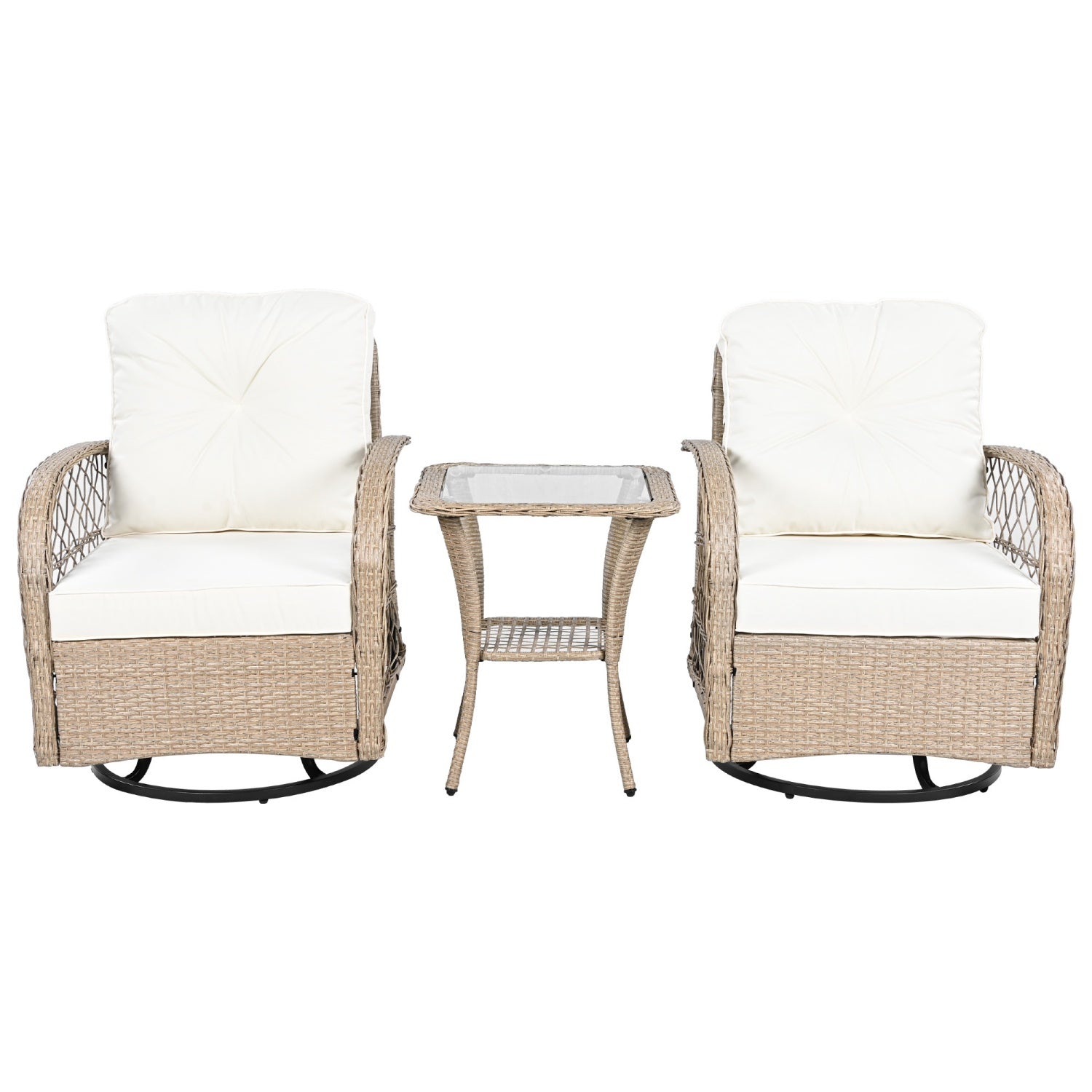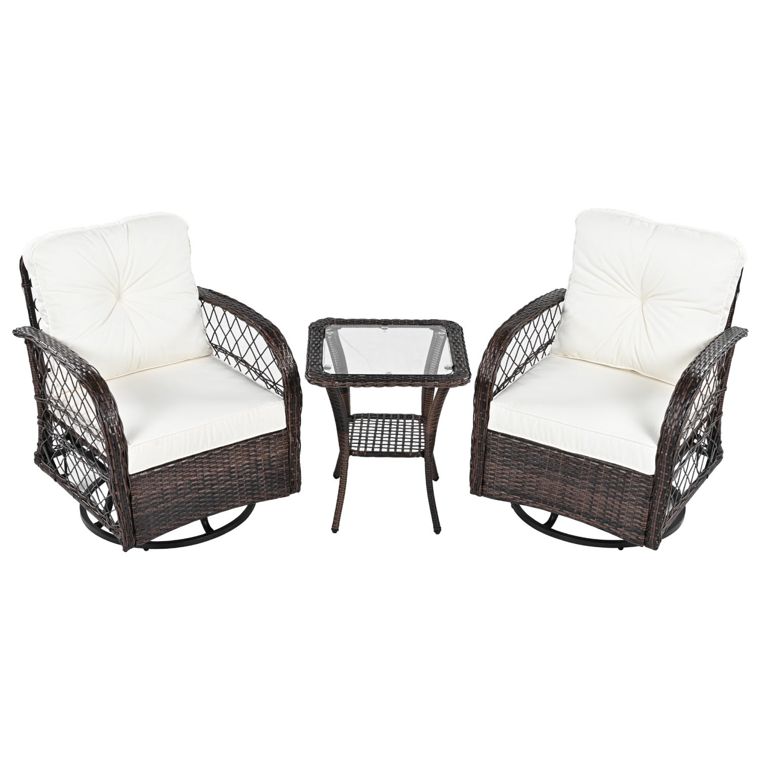 <p><b><br>✨Specification:<br></b><b>Color: </b>Natural/Brown<br><b>Material: </b>Rattan, Steel, Waterproof Fabric, Foam<br><b>Chair Size:</b> 27.6" D × 28.7" W × 35" H<br><b>Table Size:</b> 20.3" D × 20.3" W × 23.2" H<br><b>Weight Capacity: </b>400 lbs per seat<br><b>S</b><b>et Includes:</b> 2 Swivel Chairs + 1 Glass-Top Table</p>