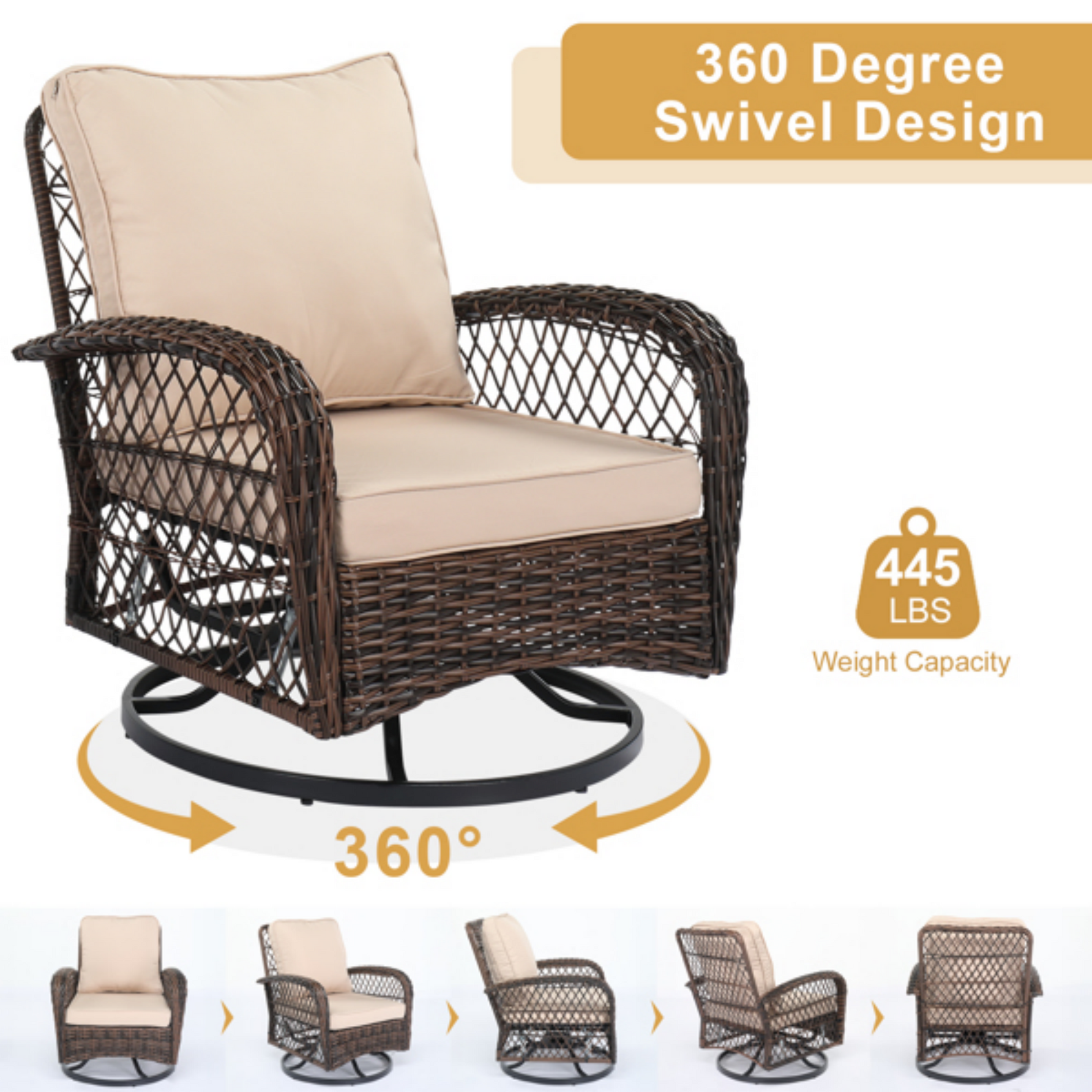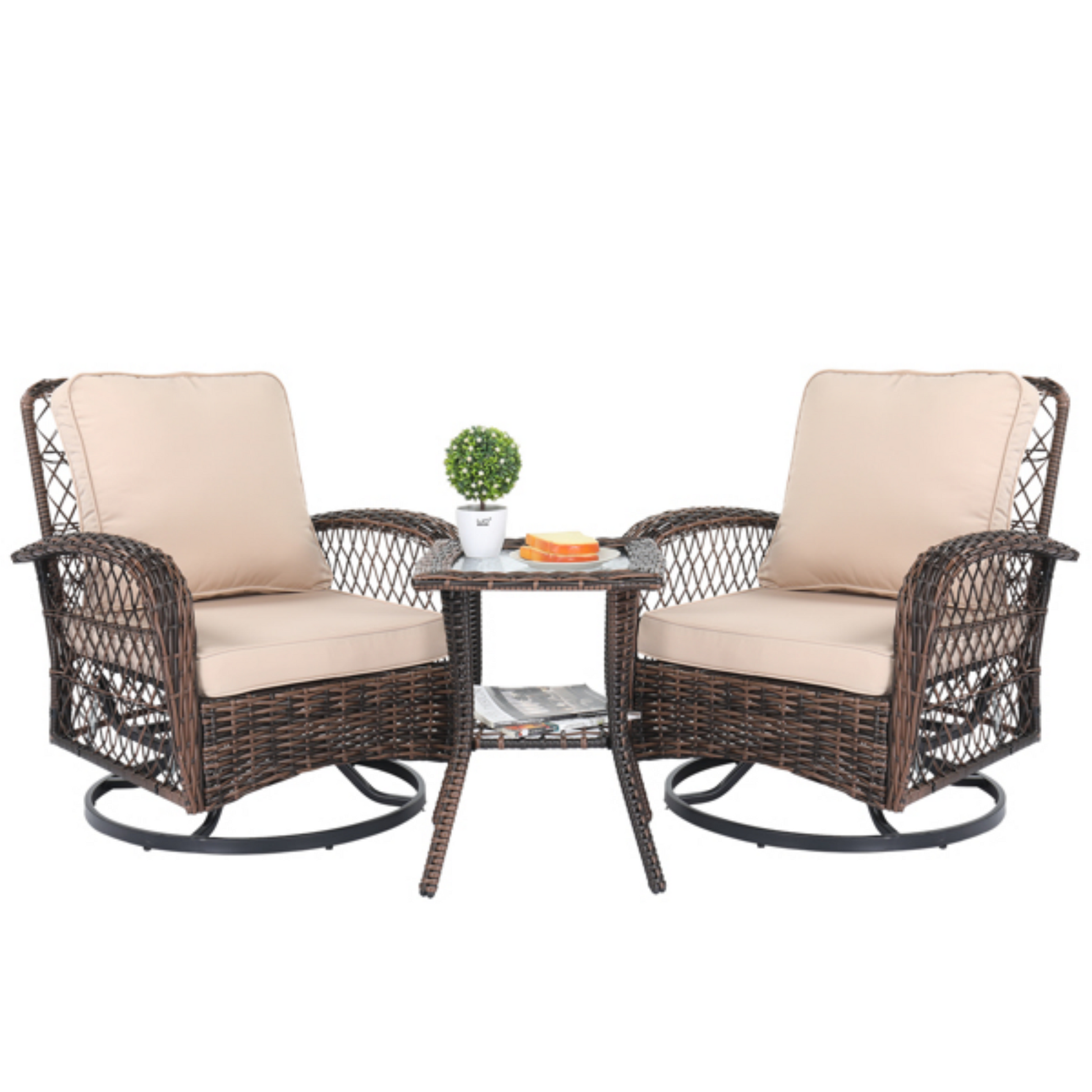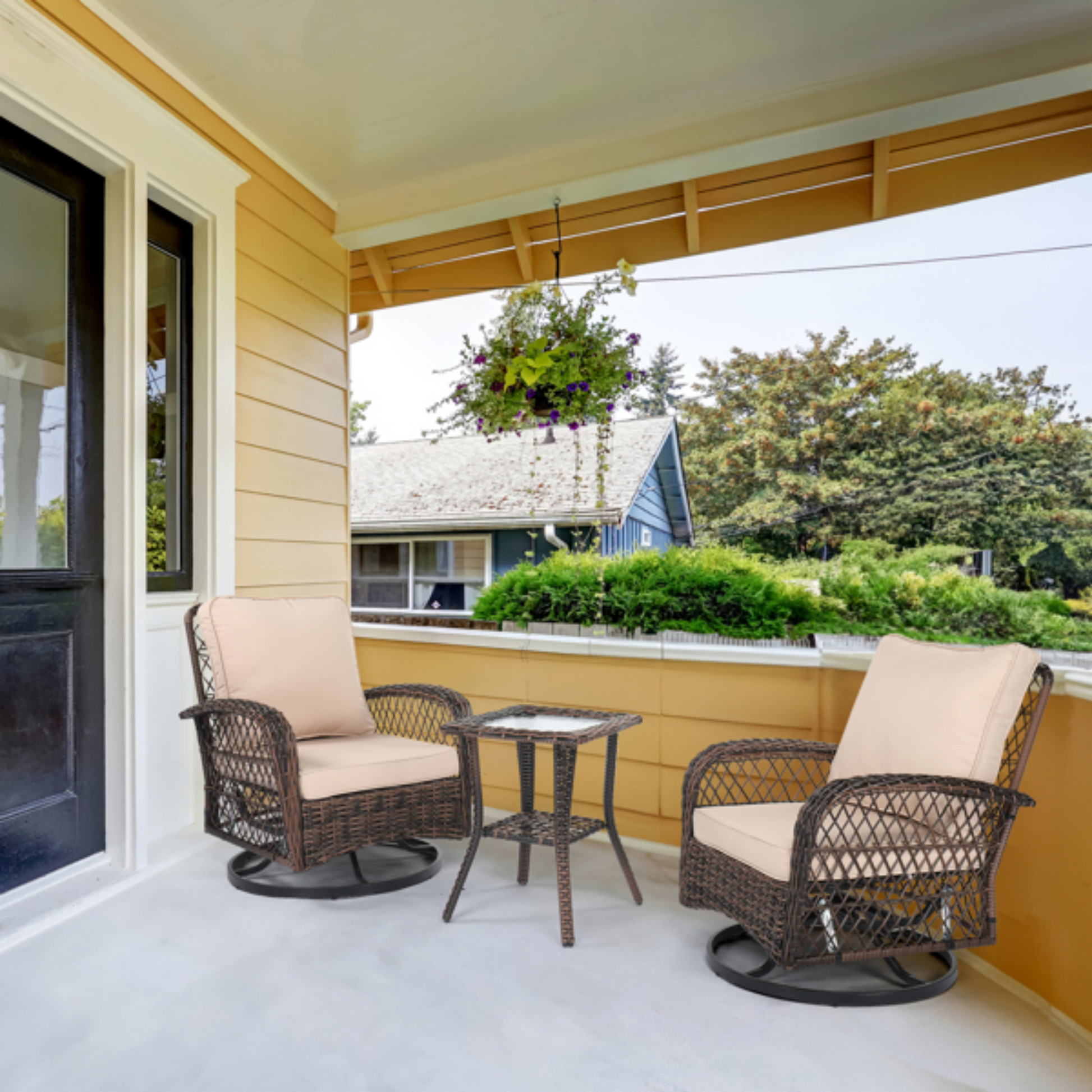 Relax in style with this 3-piece patio set featuring 360° swivel rocking chairs and a shatter-resistant glass table. The weatherproof PE rattan resists fading and cracking, while the water-resistant cushions (4" thick) ensure comfort during long lounging sessions. Compact yet sturdy, it’s perfect for small decks, porches, or poolside areas. Easy to clean and built to last.