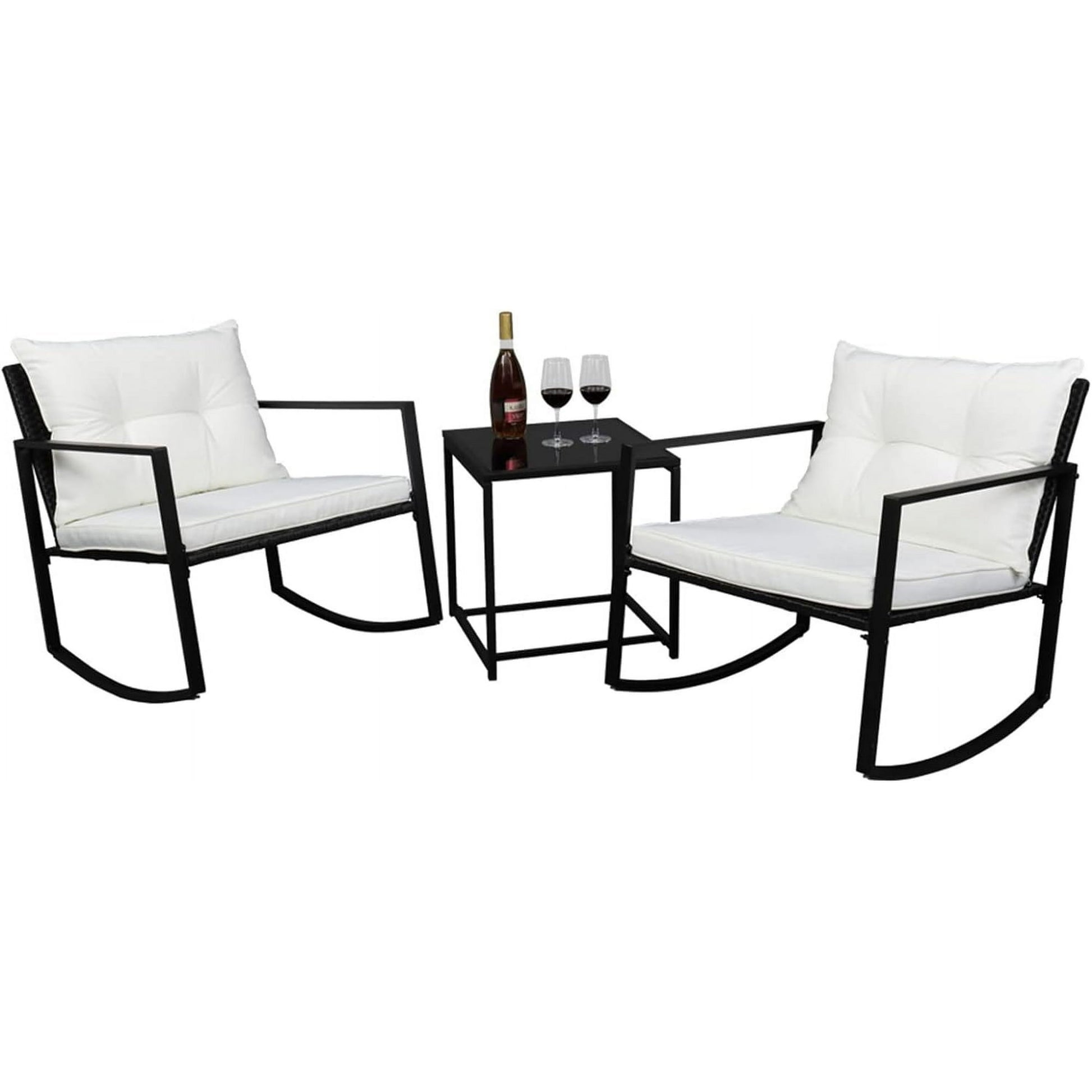 Shinpt 3-Piece Patio Furniture Set with Single 2pcs Coffee Table 1pc Exposed Rocking Chair, Modern Bistro Set Rattan Chair Conversation Sets for Garden and Patio, White Cushion and Black Table