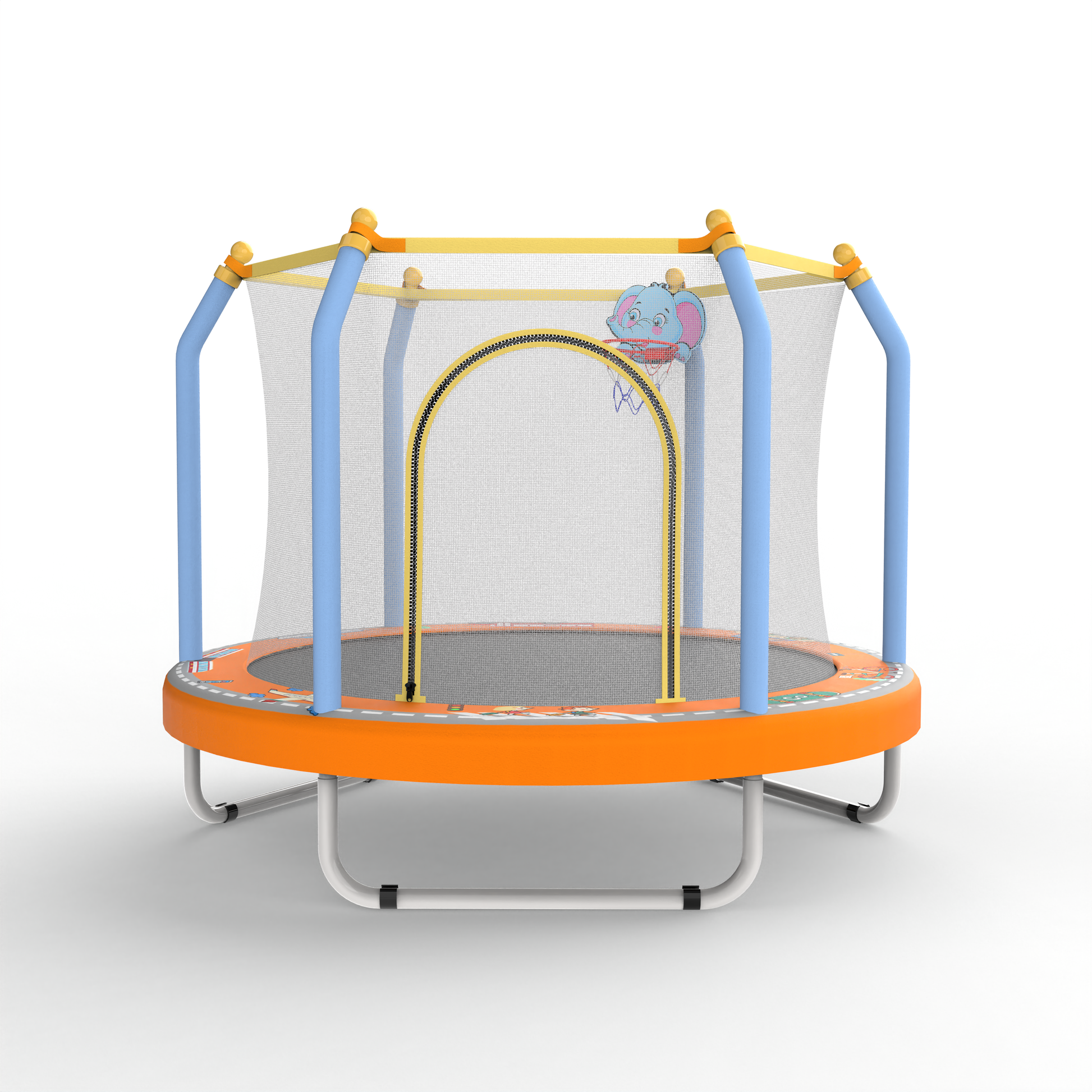 Measuring 55" in diameter and 44" in height, this trampoline is ideal for young children. The sturdy frame supports up to 110 lbs, and adult assembly is required for secure setup.